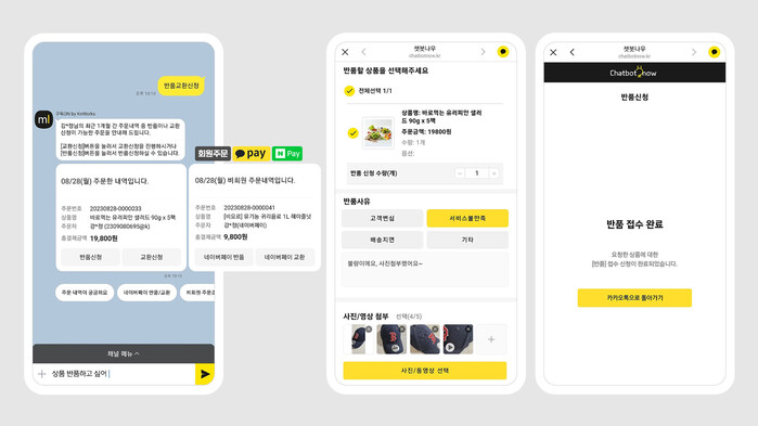 이번 챗봇나우 정식 버전을 출시하며, 전용 취소, 교환, 반품 접수 페이지를 새로 오픈했고 간편 결제 구매와 관련 CS도 처리할 수 있게 됐다. 카카오페이 등 간편결제 구매 건에 대해 주문 조회 및 간편결제 고객센터로 직접 연결이 가능하다.