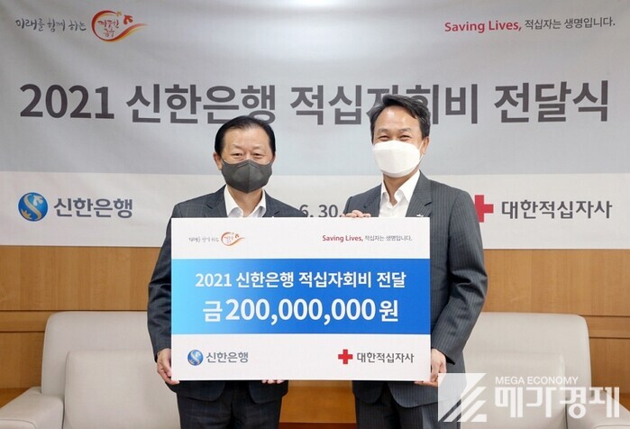 신한은행은 서울 중구 소파로 소재 대한적십자사 본사에서 신한은행 진옥동 은행장과 대한적십자사 신희영 회장이 참석한 가운데 회비와 기부금 2억원을 전달했다고 30일 밝혔다.