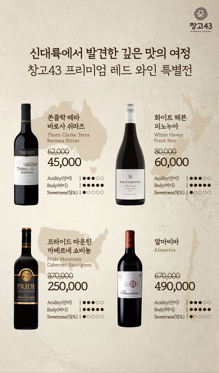 창고43은 1~2월 두 달간 ‘신대륙에서 발견한 깊은 맛의 여정’을 주제로 와인 프로모션을 진행한다고 밝혔다. 이번 행사는 프랑스·이탈리아 등 전통적인 구대륙 와인 산지 대신 미국, 호주, 칠레, 뉴질랜드 등 이른바 ‘신대륙’ 국가들의 대표 와인을 소개하는 데 초점을 맞췄다.