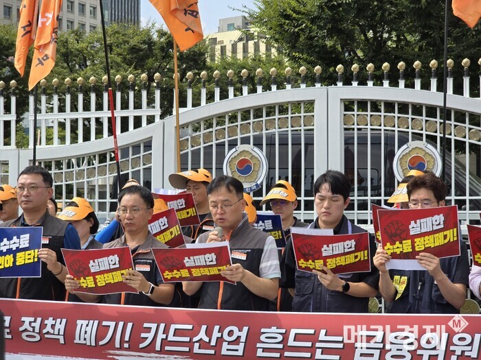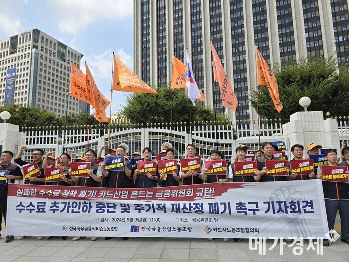 9일 오전 11시 전국사무금융서비스노동조합·전국금융산업노동조합·카드사노동조합협의회는 서울 종로구 금융위(정부서울청사) 정문 앞에서 공동 기자회견을 열었다. 이날 기자회견에서 노조들은 카드 수수료 추가 인하 중단과 주기적 재산정 제도 폐기를 요구하며 금융당국을 비판했다.