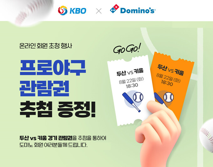 도미노피자 관계자는 “프로야구를 즐기시는 도미노피자 회원들을 위해 프로야구 관람권을 증정하는 이벤트를 기획했다”며 “야구와 도미노피자를 모두 즐길 수 있는 이번 프로모션에 많은 관심 부탁드린다.”고 말했다.