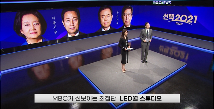 ‘크게 보는 선택 2021’을 슬로건으로 내건 MBC는 슬로건에 맞는 초대형 초고화질 ‘LED 월’을 활용한 특집 선거 방송을 준비했다.