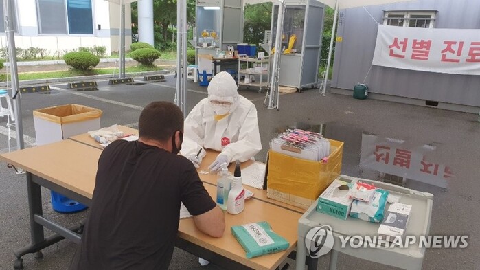 ▲ 5일 청주 흥덕보건소 선별진료소 의료진이 이슬람 종교집회에 참석했던 외국인을 대상으로 신종 코로나바이러스 감염증(코로나19) 검사에 앞서 문진을 작성중이다. [사진= 연합뉴스] |