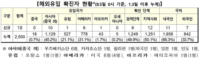 5일 0시 기준 해외유입 환자 18명의 유입국가는 우즈베키스탄과 미국이 6명으로 가장 많았고 프랑스·에티오피아·카자흐스탄·필리핀·일본·인도는 각각 1명이었다.