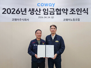 [메가경제=심영범 기자]코웨이가 생산직 노조와의 임금협약을 2개월 만에 마무리했다. 코웨이는 지난 24일 유구공장에서 생산 코웨이노동조합과 ‘2026년 임금협약 조인식’을 진행했다고 27일 밝혔다. 앞서 코웨이는 지난 2월 생산 코웨이노동조합과 임금협약 교섭을 시작해 이달 16일 잠정합의안을 도출했으며, 이후 20일부터 22일까지 진행된 조합원 찬반 투표