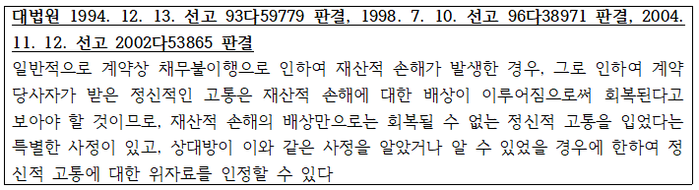 물론 이때 특별한 사정 역시 정신적인 고통이 있을 것이라는 사정을 알았거나 알 수 있었을 경우에 한하여 인정되므로 막연히 채권자가 고통스러워 했다는 것 정도만으로 인정되기는 어렵습니다.