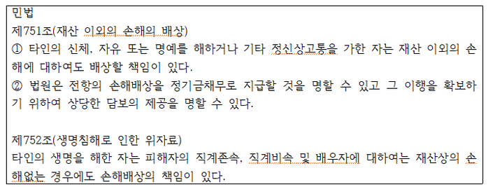 한편 민법에는 위자료의 근거에 대하여 다음과 같이 정하고 있습니다.
