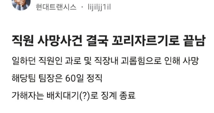9일 현대자동차그룹 계열 부품기업 현대트랜시스에 따르면 직장내 괴롭힘을 주도한 팀장과 직원을 대상으로 인사조치가 이뤄졌다. 지난 16일 상생협력팀 소속으로 알려진 근로자가 숨진 채 발견된 사건으로 인한 인사조치로 풀이된다. 하지만 회사 측의 적절한 징계 조치가 이뤄지지 않은 점에 대해서 '꼬리 자르기' 라는 비판을 피하기 어려울 전망이다.