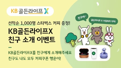 이번 이벤트는 추천받은 친구가 신규 가입 시 추천인 닉네임을 등록하면 자동으로 응모된다. 선착순 1000명을 대상으로 KB골든라이프X를 추천한 소개 회원과 추천을 받아 가입한 신규 회원 모두에게 스타벅스 커피 쿠폰을 제공한다.