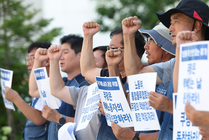 ▲ 서울 종로구 한국통합물류협회 앞에서 지난 8일 열린 택배노동자 과로사 대책위원회 주최로 열린 '택배없는 날 쿠팡 동참 촉구 대책마련 촉구 기자회견'에서 참가자들이 구호를 외치고 있다. [사진=연합뉴스] |