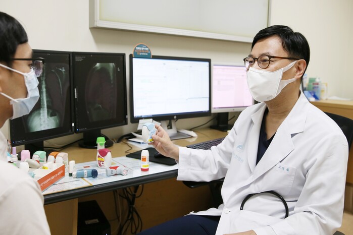 ▲서울아산병원 호흡기내과 오연목 교수가 20대 천식 환자를 진료하고 있다[사진=서울아산병원] |