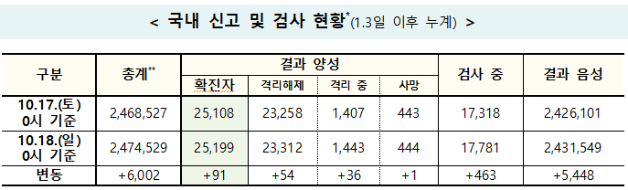 중앙방역대책본부(방대본)는 18일 0시 기준으로 전날 대비 코로나19 신규 확진자가 91명 발생해 누적 확진자수는 총 2만5199명이라고 밝혔다.