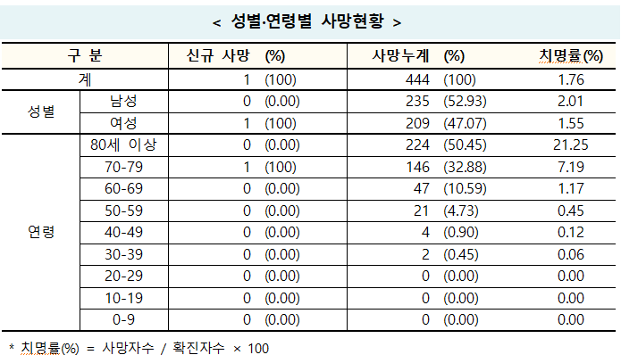 1명이 더 목숨을 잃어 누적 사망자는 444명(치명률 1.76%)이다. 위중증 환자는 77명이다.