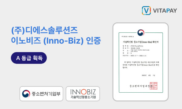 [메가경제=정진성 기자] 온·오프라인 공급망금융 플랫폼 '비타페이'를 운영 중인 디에스솔루션즈가 기술혁신형 중소기업 인증인 '이노비즈(Inno-Biz)' A등급을 획득했다고 26일 밝혔다.