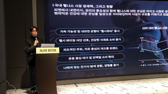유영환 데이터인텔리전스팀장은 이날 간담회에서 "웰니스가 더 이상 일부 소비자의 선택이 아닌 일상의 기본값으로 자리 잡고 있다"라며 "올리브영이 최근 발표한 소비 데이터에 따르면 건강을 위해 노력하고 있다고 응답한 소비자 비중은 70%에 달했고 웰니스 관련 상품의 매출과 구매 고객 수 역시 빠르게 증가하는 추세"라고 설명했다.