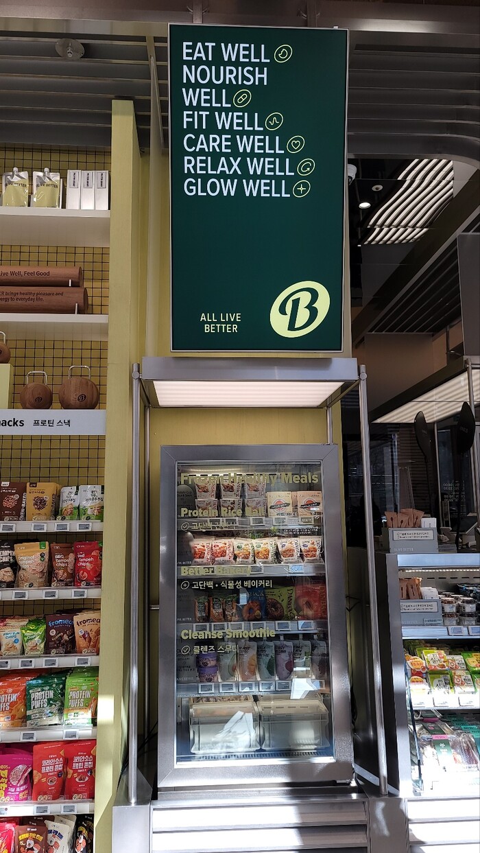 안쪽에 자리한 ‘잇 웰(Eat Well)’은 건강기능식품이 아닌 ‘건강한 식품’에 초점을 맞췄다는 설명을 들엇다. 일상적으로 영양을 보충할 수 있는 부스터 제품부터 식사 대용 제품, 헬시 스낵까지 폭넓게 구성했으며, 매장 방문 이후에도 웰리스 습관을 이어갈 수 있도록 정보 콘텐츠를 함께 제공한다.