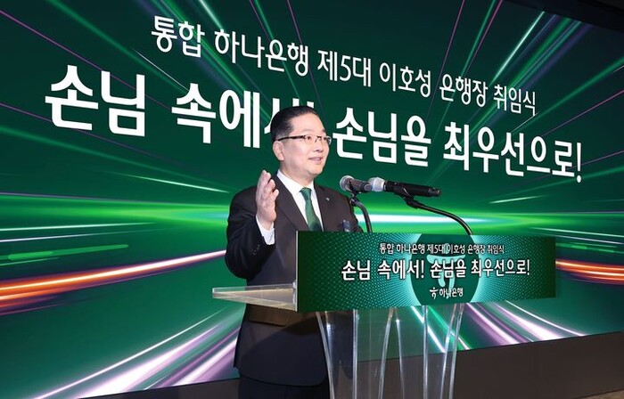 | ▲2일 서울 명동 하나은행 본점에서 열린 취임식에서 이호성 신임 행장이 취임사를 하고 있다. [사진=하나은행 제공] |