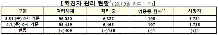 전날보다 4명이 더 목숨을 잃으면서 누적 사망자는 1735명으로 늘었다. 국내 평균 치명률은 1.67%를 보였다. 위중증 환자는 전날보다 1명 줄어 총 107명이다.