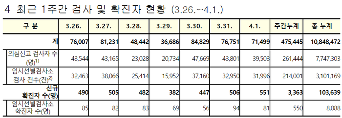 전날 하루 선별진료소를 통한 의심검사 건수는 3만9503건으로, 직전일(4만3801건)보다 4298건이 적다. 지금까지 누적 의심검사 건수는 774만7303건이다.