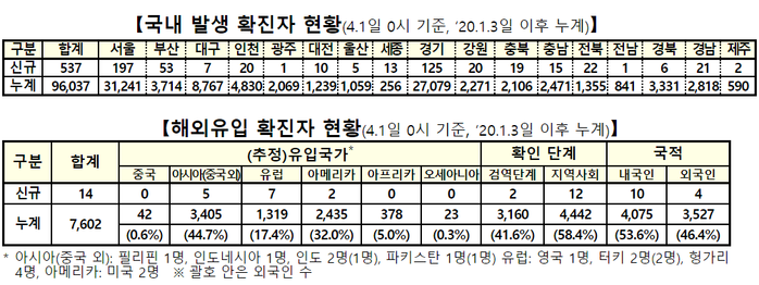 신규 확진자를 감염경로별로 보면 전국 지역 곳곳에서 발생한 국내발생(지역발생)은 537명, 해외유입은 14명이다.