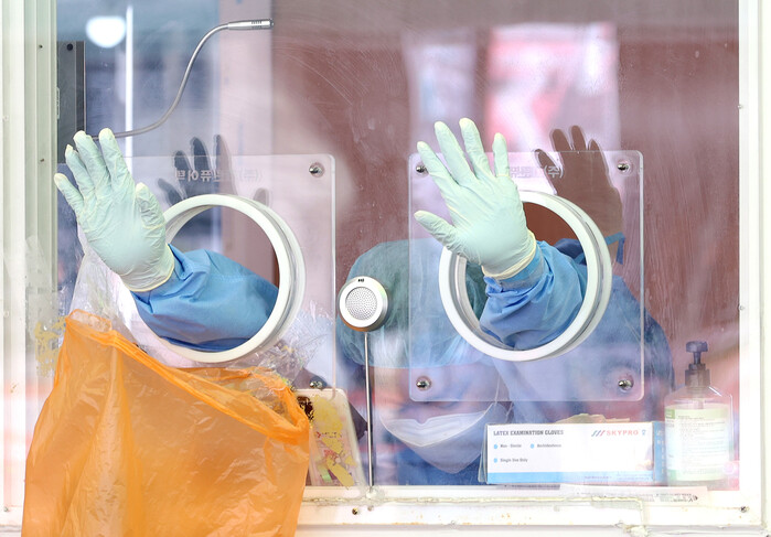 ▲ 국내 코로나19 신규 확진자 수가 이틀 연속 500명대를 기록한 1일 오전 서울역광장에 마련된 임시선별진료소에서 의료진이 잠시 몸을 풀고 있다. [서울= 연합뉴스] |
