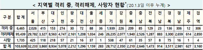 전날 409명이 추가 완치돼 누적 격리해제자는 9만5439명이고, 격리치료 중인 환자는 138명 늘어 총 6465명이다.
