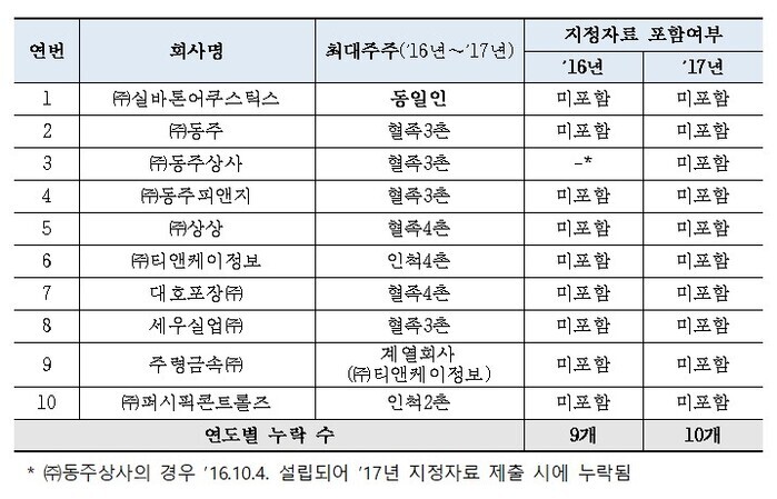 한편, 인척 4촌이 지분 100%를 보유했지만 계열사 명단에서 누락시킨 티앤케이정보와 자회사 주령금속은 지난달 15일 합병이 결정됐다. 티앤케이정보가 주령금속을 흡수합병하는 방법으로 진행됐으며, 합병목적은 자회사 결손누적에 따른 구조조정이다.