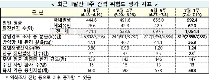 중앙방역대책본부(방대본)는 최근 1주간(7.4∼7.10) 코로나19 국내 발생 확진자가 일평균 992.4명으로 직전 1주간(6.27~7.3) 일 평균 655.0명 대비 51.5% 급증했다고 밝혔다.