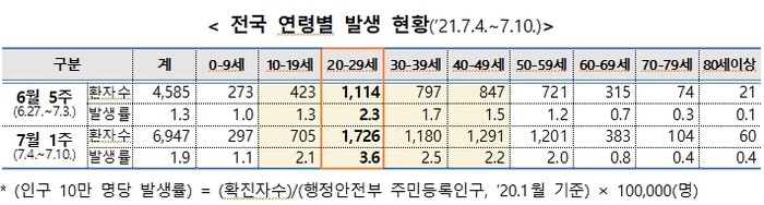 '10만 명당 2.3명→3.6명' 2주 연속 20대 발생률 가장 높아