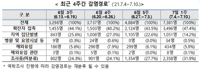 최근 4주간 감염 경로를 살펴보면, 가족·지인·직장 등 소규모 접촉감염이 늘어나면서 확진자 접촉 비중은 직전 주간 43.5%(2124명)에서 최근 1주간 47.4%(3496명)로 오르는등 계속 증가세를 보였다.