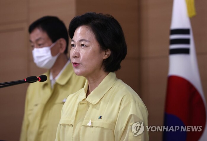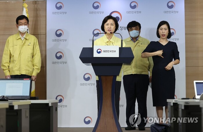 ▲ 추미애 법무부 장관(가운데)와 진영 행정안전부 장관(왼쪽), 한상혁 방송통신위원장이 21일 오후 정부서울청사에서 코로나19 관련 대국민 담화를 발표하고 있다. [서울= 연합뉴스] |