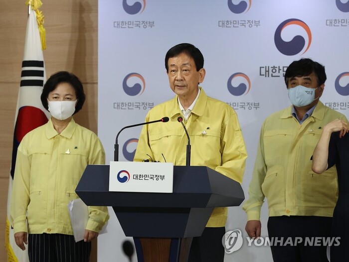 ▲ 진영 행정안전부 장관이 21일 오후 정부서울청사에서 추미애 법무부 장관, 한상혁 방송통신위원장과 함께 코로나19 관련 대국민 담화를 발표하고 있다.[서울= 연합뉴스] |