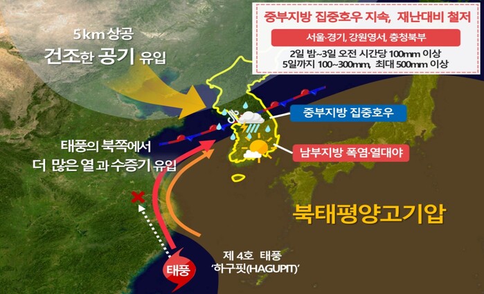 기상청은 “오는 5일까지 중부지방과 북한지역을 오르내리는 정체전선의 영향으로 많은 비가 예상된다”며 “중국 남동해안의 상해남쪽을 향해 이동 중인 제4호 태풍 ‘하구핏’에 동반된 매우 많은 양의 수증기가 우리나라로 추가 유입되면서 앞으로 내리는 비의 강도는 더욱 강해질 것으로 예상된다” 고 말했다.
