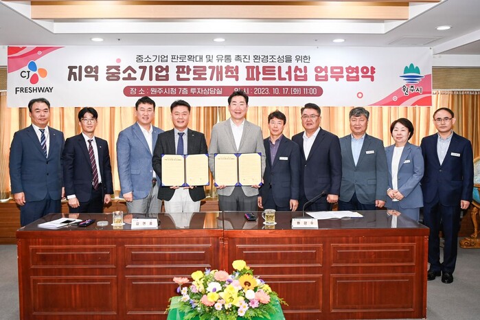 CJ프레시웨이는 17일 원주시청에서 강연중 CJ프레시웨이 부사장, 원강수 원주시장 등 주요 관계자들이 참석한 가운데 지역 중소기업의 우수제품 발굴 육성 및 판로 확대 지원 등 상생발전을 위해 상호 협력하기로 뜻을 모았다.