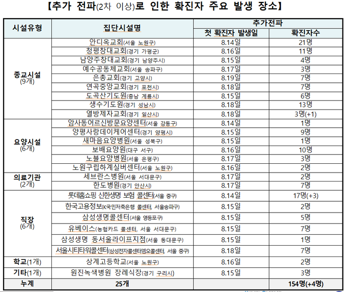 ▲ 사랑제일교회 관련 추가 전파(n차감염)로 인한 확진자 주요 발생 장소. [출처= 중앙방역대책본부] |