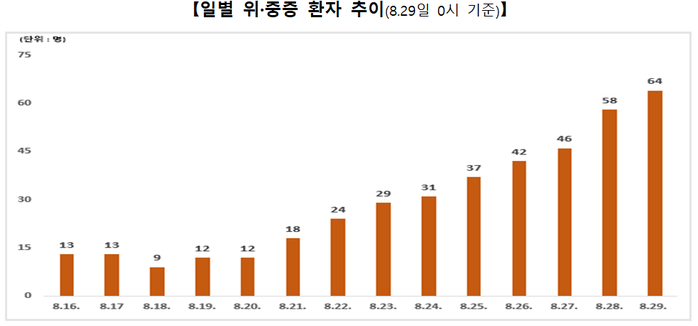 오늘(29일) 위·중증 환자는 총 64명으로, 연령별로는 60대 이상이 54명(84.4%), 50대 7명(11%), 40대 3명(4.7%)이었으며, 현재까지 파악된 바에 의하면 기저질환이 있는 환자는 39명이다.