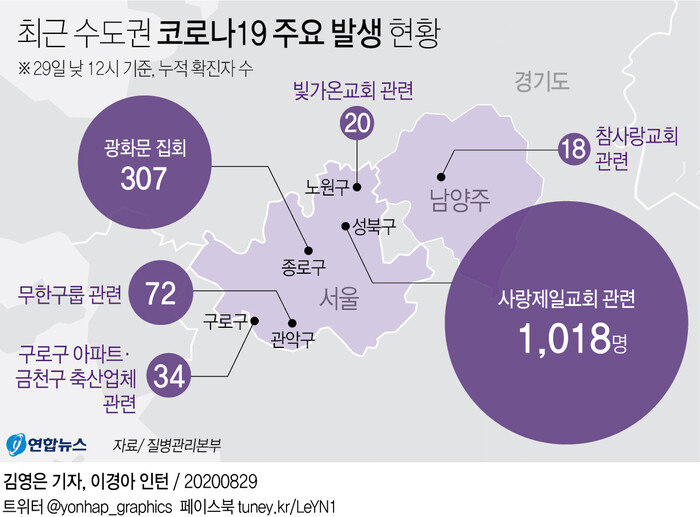 ▲ 최근 수도권 코로나 19 주요 발생 현황 [그래픽= 연합뉴스] |