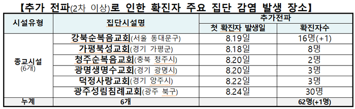 6개소는 서울 동대분구 강북순복음교회(16명), 광주성림침례교회(30명) 등 모두 교회 관련 시설이다.