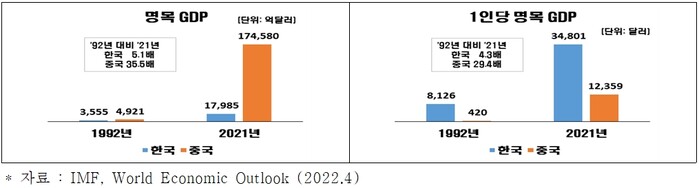 명목 GDP는 한국이 1992년 3555억 달러에서 2021년 1조7985억 달러로 약 5.1배 성장한 반면, 중국은 같은 기간 4921억 달러에서 17조4580억 달러로 약 35.5배의 폭발적 성장을 했다.