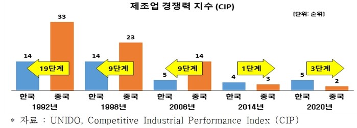 제조업경쟁력을 분석해 국가마다 순위를 부여하는 유엔산업개발기구(UNIDO)에 따르면 제조업경쟁력지수(CIP)의 경우, 1992년 한국은 14위였고 중국은 이보다 19단계 아래인 33위에 있었다. 그러나 2020년에는 중국이 2위, 한국 5위로 중국이 한국보다 3단계 앞섰다.