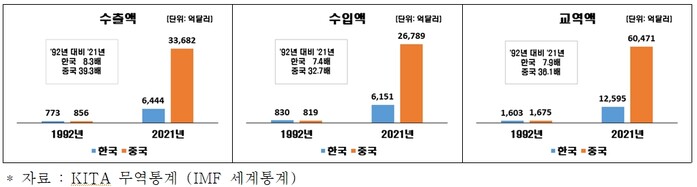수출과 수입을 합한 교역 면에서는 중국이 한국의 약 4.8배 규모로 성장했다. 한국의 1992년 당시 교역액은 중국과 큰 차이가 없었지만(한국 1603억 달러, 중국 1675억 달러), 2021년에는 한국의 교역액이 1조2595억 달러인 반면 중국은 6조471억 달러로 큰 폭으로 확대됐다.
