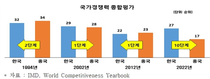1994년 당시 경쟁력 순위를 보면 한국이 32위, 중국이 34위였다. 하지만 2022년에는 중국이 17위, 한국이 27위로 나타나 중국이 한국을 크게 앞섰다.