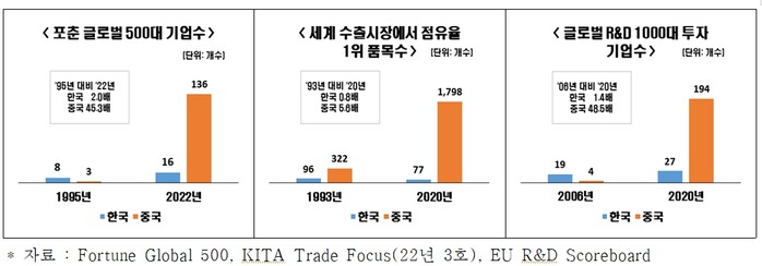 이렇다 보니 한·중 양국 기업의 경쟁력을 보여주는 지표인 ‘포춘 글로벌 500대 기업 수’, ‘세계 수출시장 점유율 1위 품목 수’ 모두 중국이 한국을 추월했다.