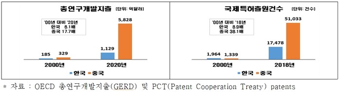 중국의 총연구개발지출은 2000년 329억 달러에서 2020년 5828억 달러로 17.7배 증가했다. 반면 한국은 같은 기간에 6.1배 증가에 그쳤다.