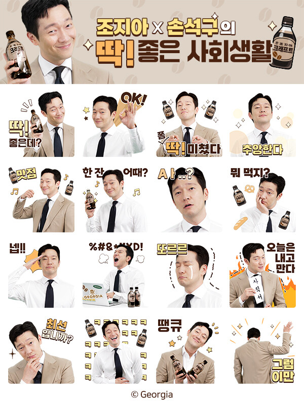 이번 이모티콘은 소비자에게 일상 속 함께 하는 다양한 브랜드 경험을 제공하고자 기획됐다. 조지아X손석구 이모티콘은 ‘딱! 좋은데’를 콘셉트로 실제 사회생활에 사용하기 좋은 인사, 감사, 분노 등 다양한 감정표현 총 16종으로 구성됐다. 특히 손석구 특유의 능숙하고 익살스러운 표정으로 사회생활의 희로애락을 표현해 직장인들의 공감을 이끌어 낼 수 있도록 제작됐다.
