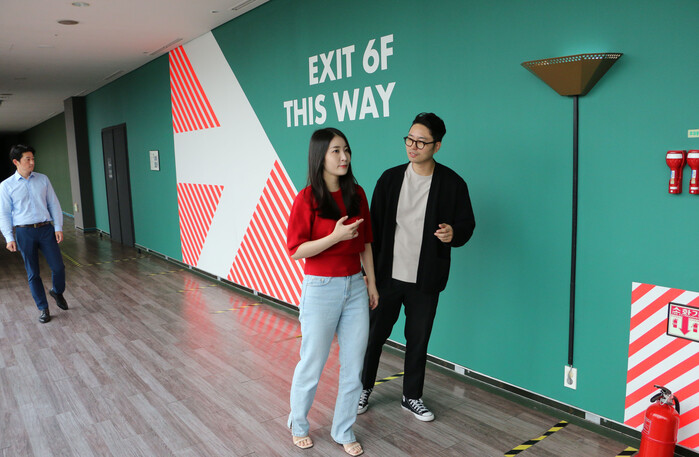 ▲CGV 영등포 스피어엑스관 퇴장로에 시공된 KCC 컬러유니버설 디자인이 적용된 출구 방향 안내에 따라 관람객들이 퇴장하고 있다. [사진=KCC] |