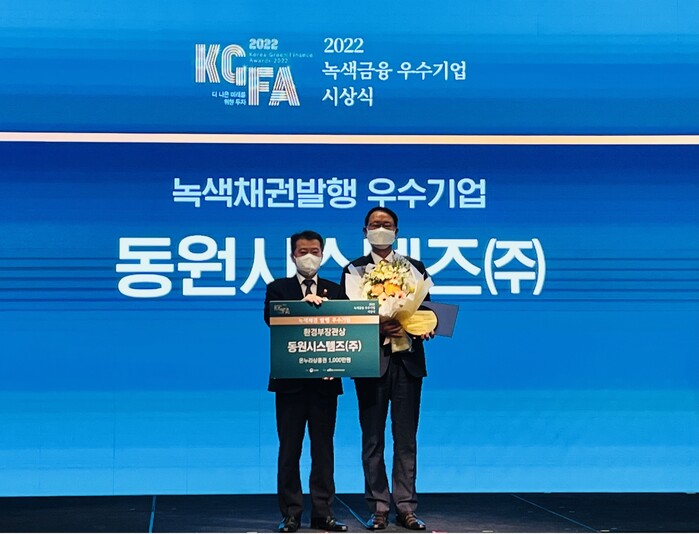 동원시스템즈가 지난 13일 서울 여의도 콘래드호텔에서 진행된 ‘2022년 녹색금융 우수기업’ 시상식에서 녹색채권 발행 우수 기업으로 선정돼 환경부 장관상을 수상했다고 14일 밝혔다.