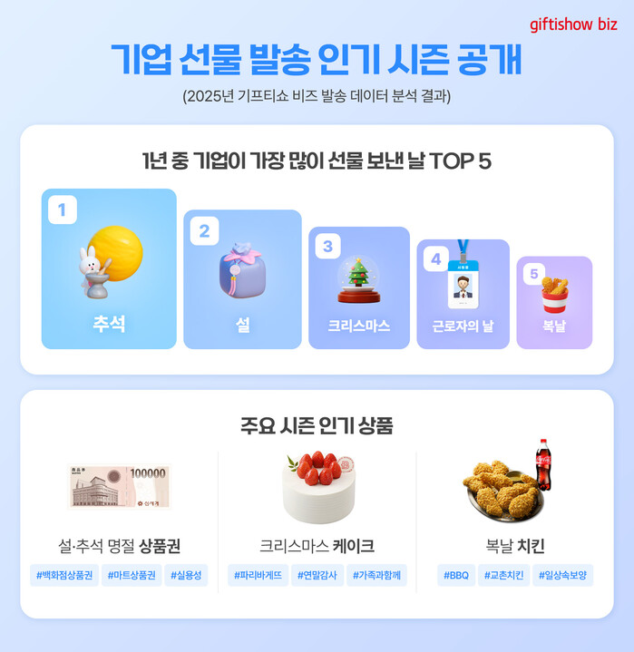 [메가경제=심영범 기자]KT알파가 운영하는 기업 전용 모바일 상품권 대량발송 서비스 ‘기프티쇼 비즈’가 2026년 새해를 맞아 기업 담당자들이 시즈널 이벤트 운영 시 참고할 수 있는 주요 발송 시점과 인기 상품을 14일 공개했다.