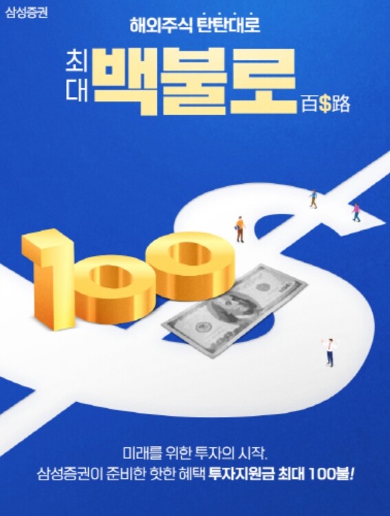 | ▲ 삼성증권(사장 장석훈)은 해외주식 거래 경험이 없었던 고객을 대상으로 최대 100달러를 지원하는 '백불로(百$路)' 이벤트를 8월 31일까지 진행한다. [자료=삼성증권 제공] |