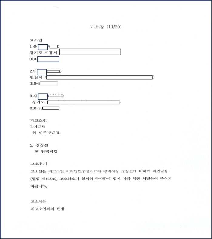 28일 피해자모임에 따르면 이재명 대표의 경우 경기도지사 재직 시절 조합 핵심 간부 A씨의 농지법 위반 사실을 묵인했고, 정장선 평택시장은 A 씨의 해당 사업 토지확보가 안되었음에도 조합설립인가를 받아 준 혐의로 각각 고발하게 됐다고 밝혔다.